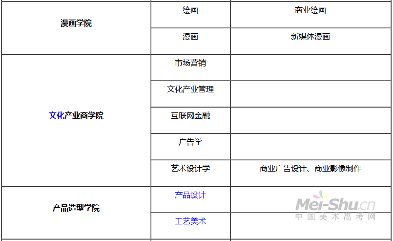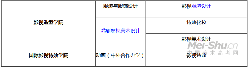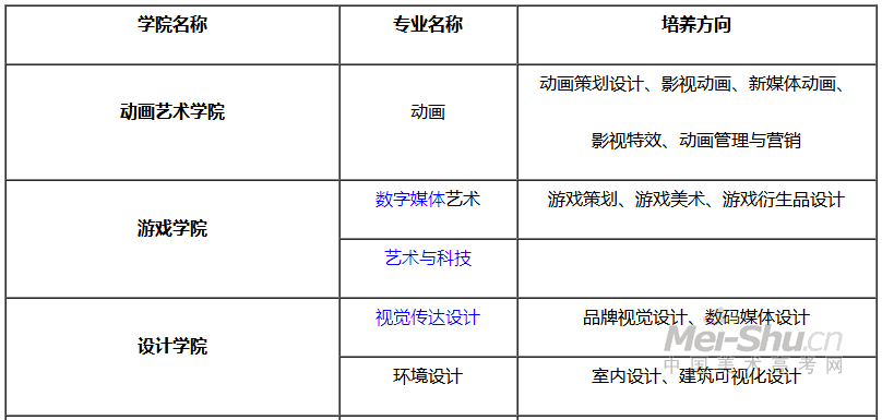 (一)美术设计类专业,包括:动画、数字媒体艺术、艺术与科技、视觉传达设计、环境设计、绘画、漫画、艺术设计学、产品设计、工艺美术、服装与服饰设计、戏剧影视美术设计、动画(中外合作办学),共13个专业,全国30个省市区招生。认可各省、市、自治区美术统|联考成绩,无需参加校考。考生高考时直接填报志愿即可。